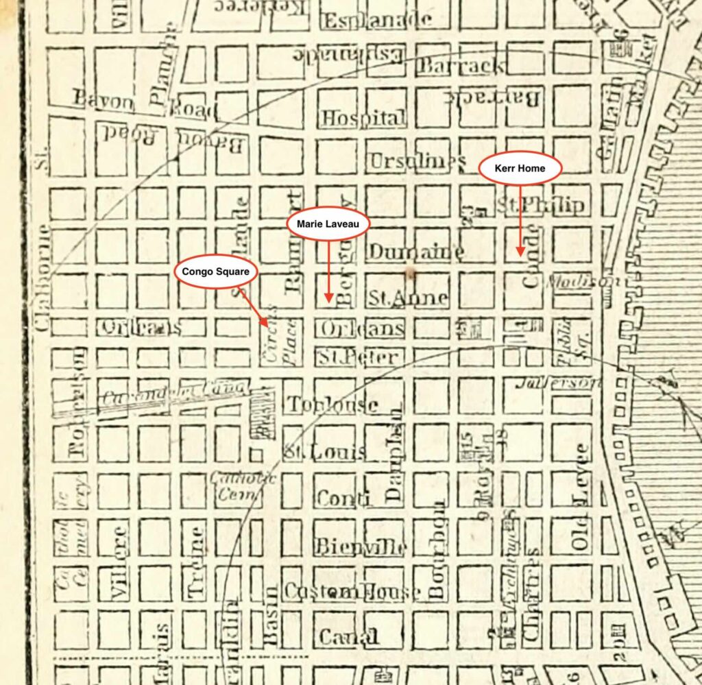 Oh, and I know where he lived when he wrote out his last will. “repair to the domicile of Josias Elliot Kerr, situated on Dumaine Street, between Condé and Royal Streets, and there found the said Josias Elliot Kerr sick in bed, but of sound mind, memory and understanding…” This is an 1850 map of the district. Kerr and Marie lived a few blocks from each other.