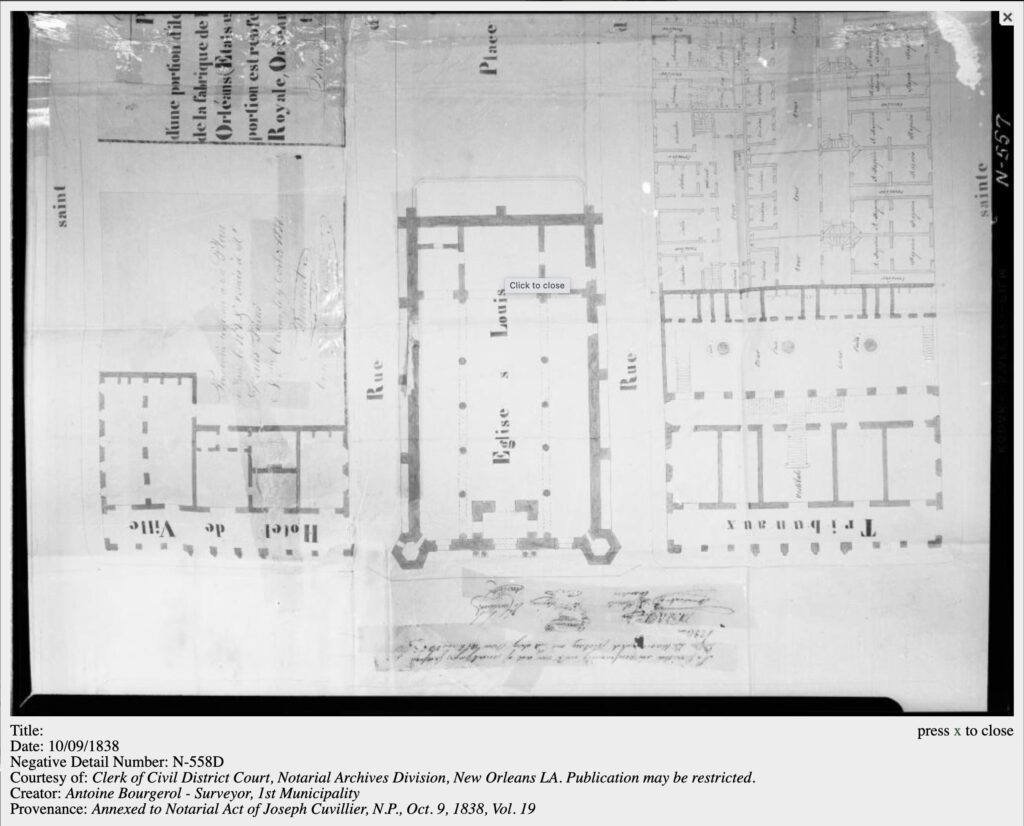 The floor plan comes from a resource I’ve used extensively, it is an architectural survey of the Vieux Carré, with all the real estate transactions over the centuries. So, the fact that pirate and smuggler Lafon was neighbors to Charlotte Brion the former slave one owned by Zénon Trudeau? Yep, all from there. This floor plan was attached to a notarial record for a property transaction on the alley next to the church. WOOHOO!
