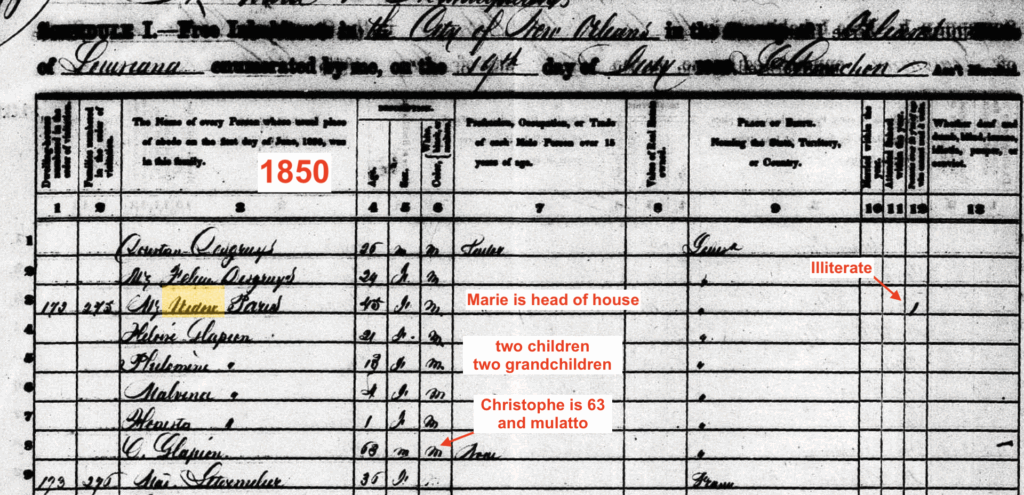 Where many strived to pass for white, Christophe Glapion passed for Black to live with the woman of his dreams. I suspect he was white when it suited, and Black the rest of the time. He lived with a foot in both worlds. Like the Pope’s ancestors, he shows up in one census as colored, and in another as white. Truth, I suspect that being able to pass in both worlds meant that he could escape SOME of the social cost. But it wasn’t zero. I have the documents, the real estate transactions, the wills that show the family finagling the oppressive system to maintain a legacy.