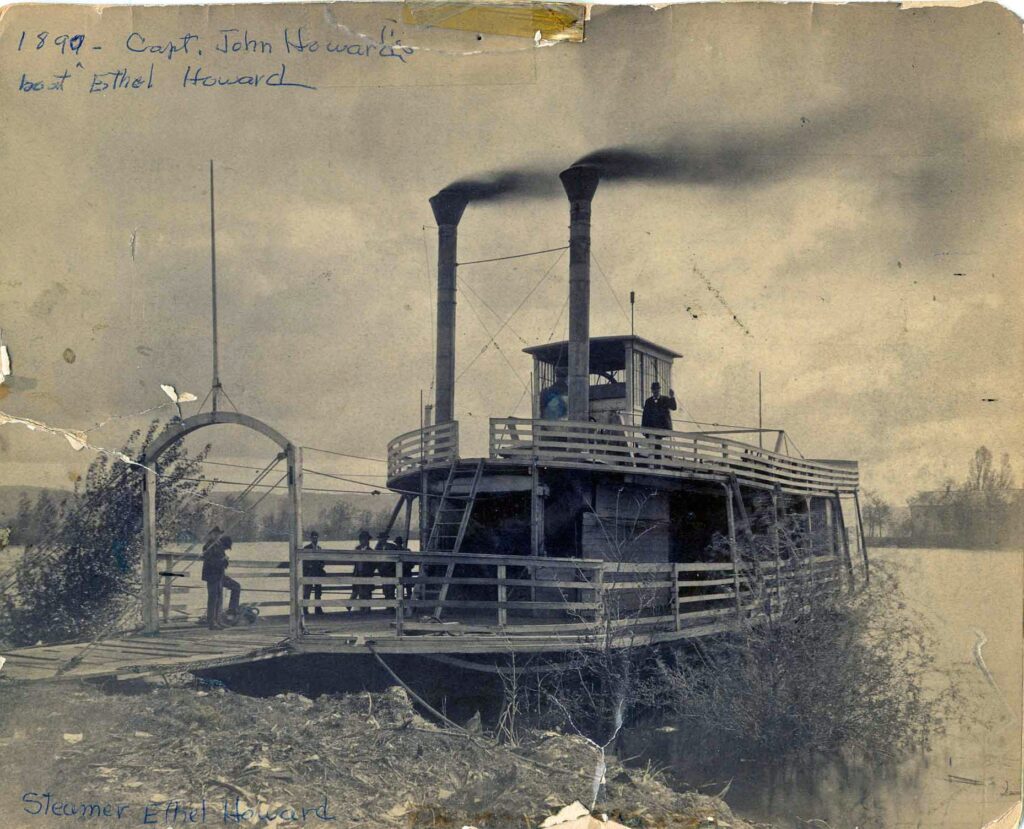 The photo of the ramshackle steamboat is a sternwheeler from about 1899. Early on, sidewheelers were more common – more maneuverable. Good ones had a transmission, make one wheel go faster than the other, even go backwards.